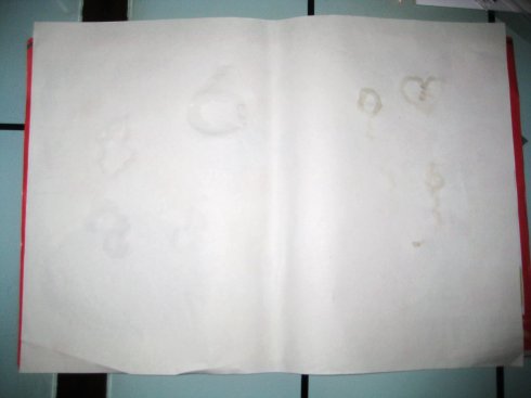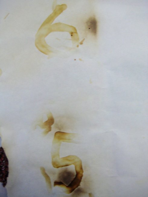 经过高温烘烤,白醋画过的纸面迅速显现出黄褐色的图案;而白糖画过的纸面显现图案的时间比白醋略长一些。