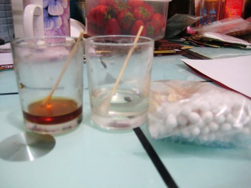 白糖水、白醋各一小杯、棉花签一包、白纸一张;